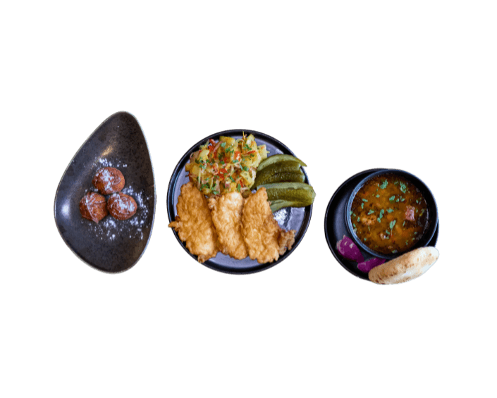 FEL 1: ciorbă de fasole cu cârnaț țărănesc afumat (350g), pâine pe vatră (100g), 1/4 ceapă roșie; FEL 2: șnițel de pui parizian (150g), cartofi țărănești (200g), castraveți murați în saramură (100g) FEL 3: papanași cu Nutella