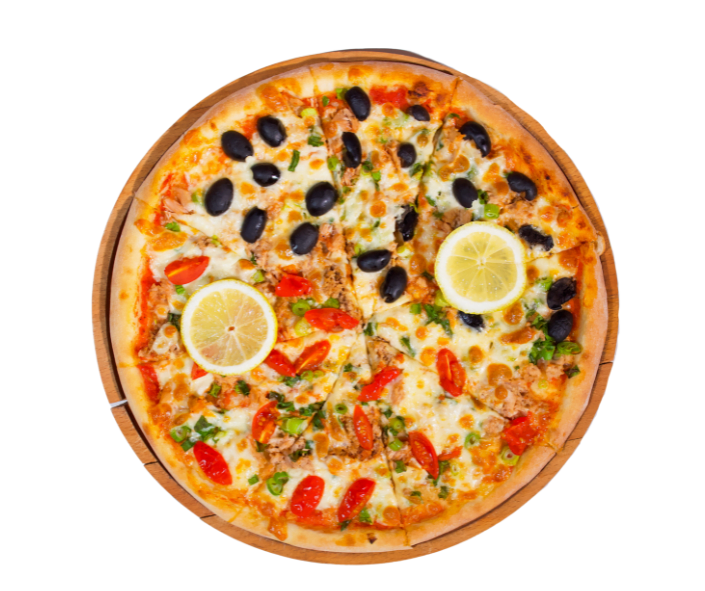blat pizza, sos de roșii, mozzarella, ton bucăți premium, ceapă verde, roșii cherry, măsline, lămâie
